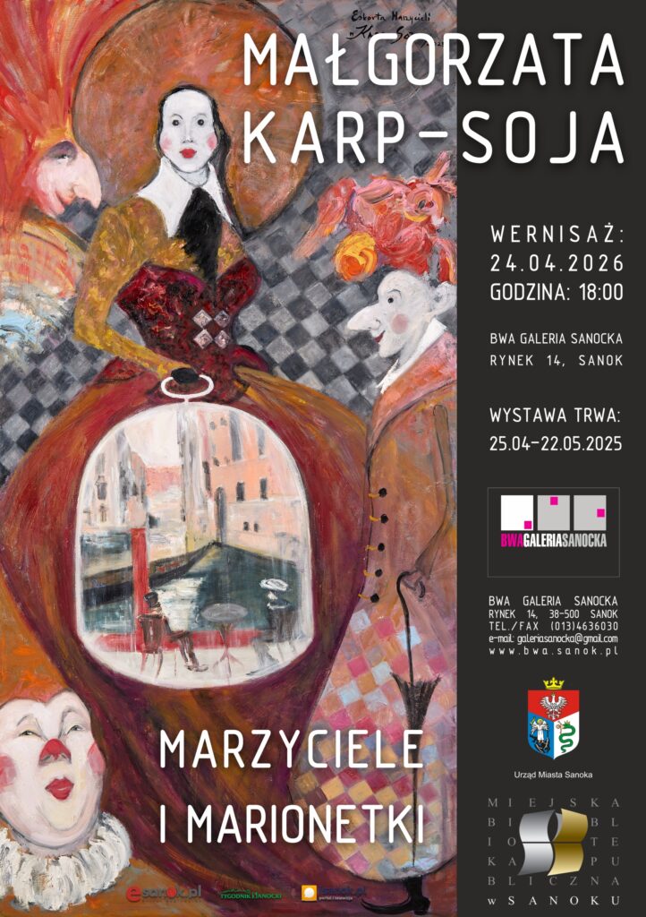 Zapraszam Państwa na wystawę, która stanowi część trzecią i ostatnią cyklu wystaw, których motywem przewodnim są marzenia i marzyciele. Część pierwszą pt. „Marzyciele z Partytury” zaprezentowałam w Filharmonii Bałtyckiej w Gdańsku, część drugą pt. „Świat Marzycieli” w Galerii BWA w Sandomierzu, a część trzecią pt. „Marzyciele i Marionetki”, stanowiącą swego rodzaju grande finale całego cyklu, w Galerii BWA w Rzeszowie.